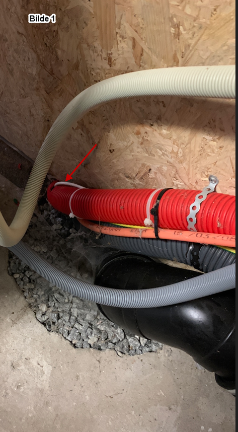 Installasjonen av termostaten. Ideelt skal temperaturføler ligge på det grunneste punktet rørene ligger på. Når termostat etter monteres er dette ikke lett å få til, så enten må føler ut i luften eller ned i grunnen ute. Dette var relativt enkelt hos meg da vi benyttet trekkrøret til de elektriske kablene som går ut til kvernpumpen. Føleren stakk vi ned ca 1,5 m fra punktet hvor trekkrøret går gjennom kjellergulv og ut i renna hvor vannledning og trekkrør ligger. Se bilde1.