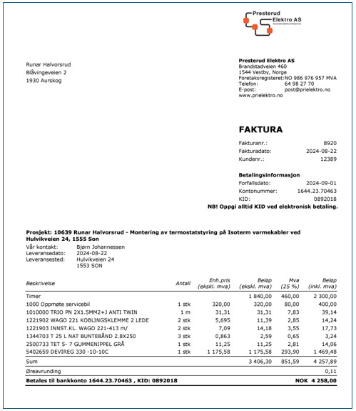 Jeg vedlegger faktura fra Presterud Elektro.