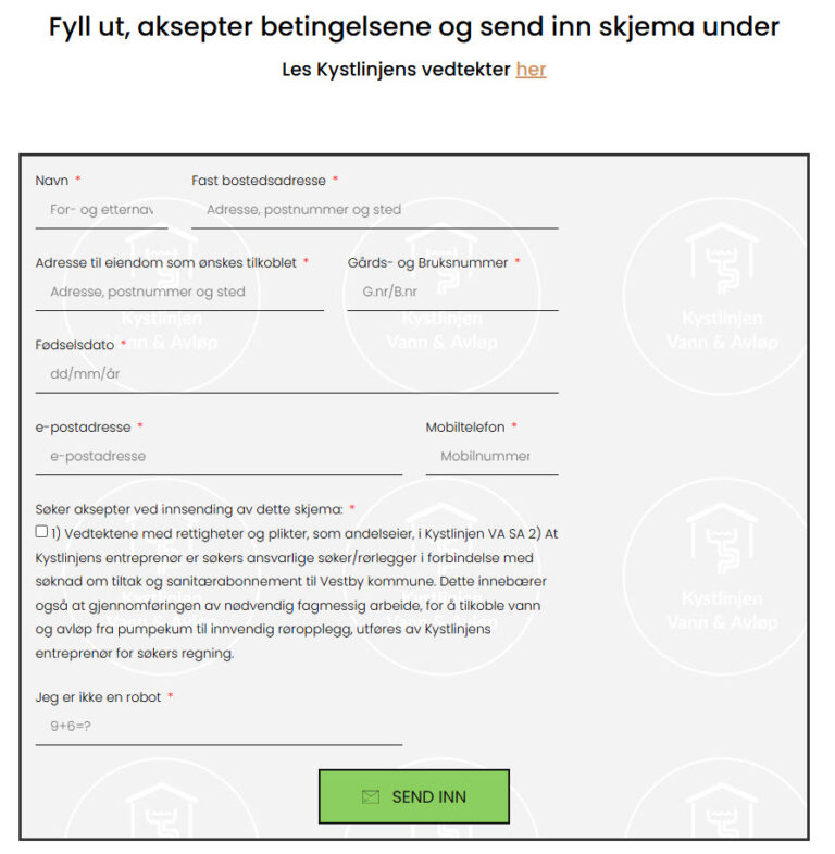 - Ved søkers aksept av tilbudene aksepteres medlemskap i Kystlinjen VA SA