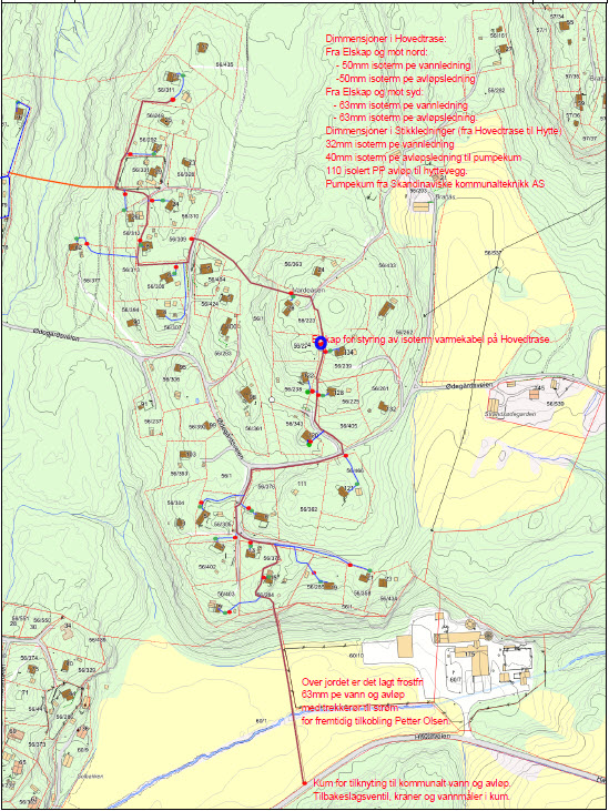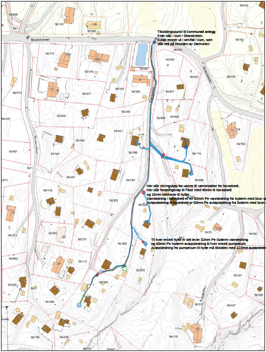 Kartene under har til hensikt å vise hvor påkoblingspunktet er til hovedledningen for den enkelte stikkledning. Kartene vi har er dessverre ikke komplette. Det jobbes med å fremskaffe bedre kart med høyere detaljeringsgrad. Inntil videre legger vi ut det som p.t. er tilgjengelig. Finner du ikke svar for din eiendom, ta kontakt med oss og vi skal finne ut av det.